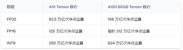不同精度下 A10 和 A100 的每秒操作數(shù)比較
