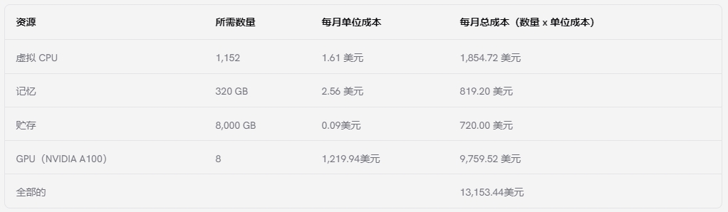 使用捷智算平臺(tái)上 A100 GPU 的中位數(shù)價(jià)格,以下是每種所需資源的成本: