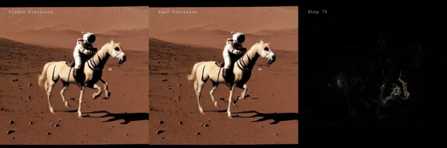 有趣的是,這種差異可能并不意味著半精度輸出中存在偽影。例如,在步驟 70 中,下圖顯示半精度沒有在單精度輸出中產(chǎn)生偽影(額外的前腿):