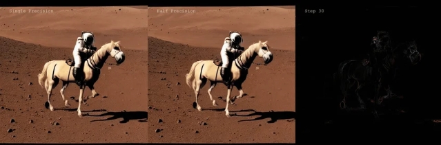 我們的觀察是,單精度輸出和半精度輸出之間確實(shí)存在明顯差異,尤其是在早期步驟中。差異通常會隨著步驟數(shù)量的增加而減小,但可能不會消失。