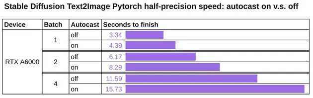 Hugging Face 團(tuán)隊(duì)對其擴(kuò)散器代碼進(jìn)行的更新聲稱,刪除自動投射可將 pytorch 的半精度推理速度提高約 25%。