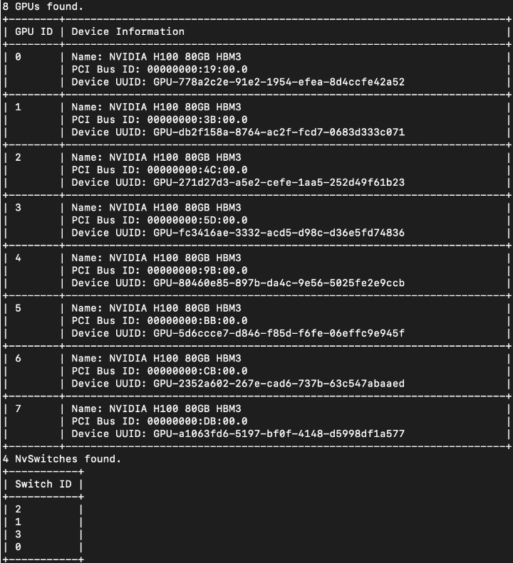 此命令將返回一個(gè)布爾值(True/False),讓您知道 GPU 是否可用。如果為 false,則表示您的實(shí)例需要安裝 Nvidia 的 Fabric Manager。這是 8 路 A100 和 H100 系統(tǒng)所必需的。