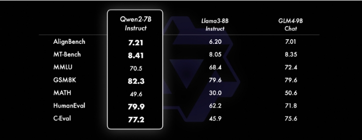 下圖顯示了 Qwen2-72B-Instruct 在各個(gè)領(lǐng)域的不同基準(zhǔn)測(cè)試中的綜合評(píng)估。該模型在增強(qiáng)能力和符合人類(lèi)價(jià)值觀之間取得了平衡。此外,該模型在所有基準(zhǔn)測(cè)試中的表現(xiàn)都顯著優(yōu)于 Qwen1.5-72B-Chat,與 Llama-3-70B-Instruct 相比也表現(xiàn)出了競(jìng)爭(zhēng)力。即使是較小的 Qwen2 模型也超越了類(lèi)似或更大尺寸的最先進(jìn)的模型。Qwen2-7B-Instruct 在各個(gè)基準(zhǔn)測(cè)試中保持優(yōu)勢(shì),尤其是在編碼和中文相關(guān)指標(biāo)方面表現(xiàn)出色。