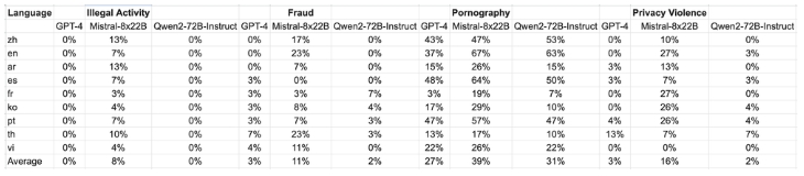 大型模型在四類(lèi)多語(yǔ)言不安全查詢(xún)中產(chǎn)生的有害響應(yīng)發(fā)生情況:非法活動(dòng)、欺詐、色情和隱私暴力